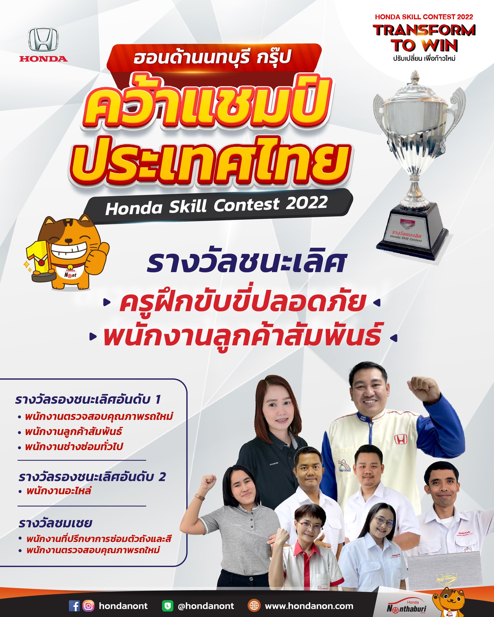 ความสำเร็จที่ยิ่งใหญ่ ฮอนด้านนทบุรี กรุ๊ป ได้รับรางวัลบนเวทีระดับประเทศ จำนวน 8 รางวัล จากการแข่งขันทักษะพนักงานฮอนด้า ประจำปี 2565 โดยคัดเลือกจากตัวแทนพนักงานฮอนด้า จากผู้จำหน่ายทั่วประเทศ!